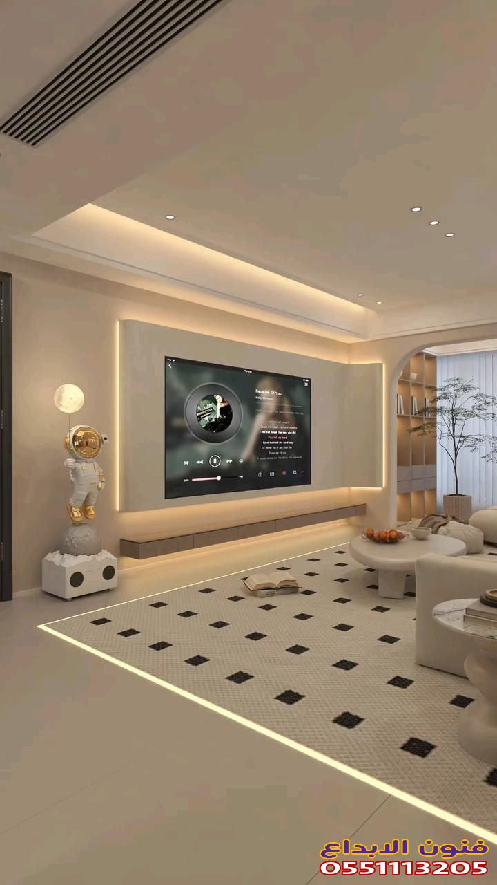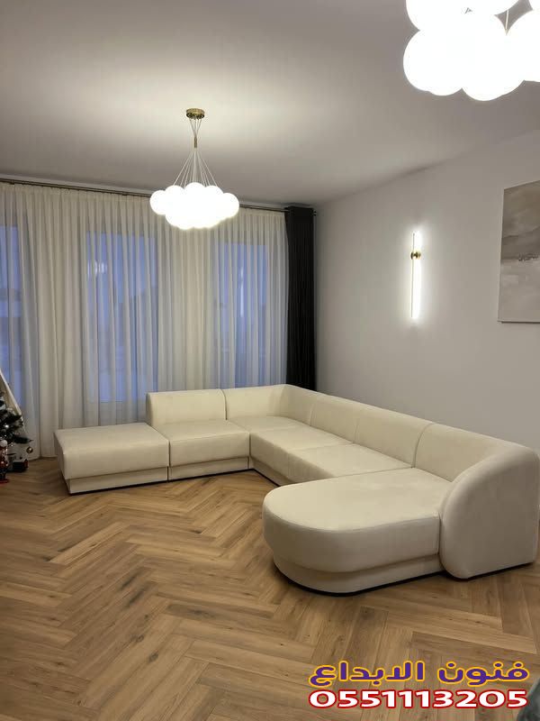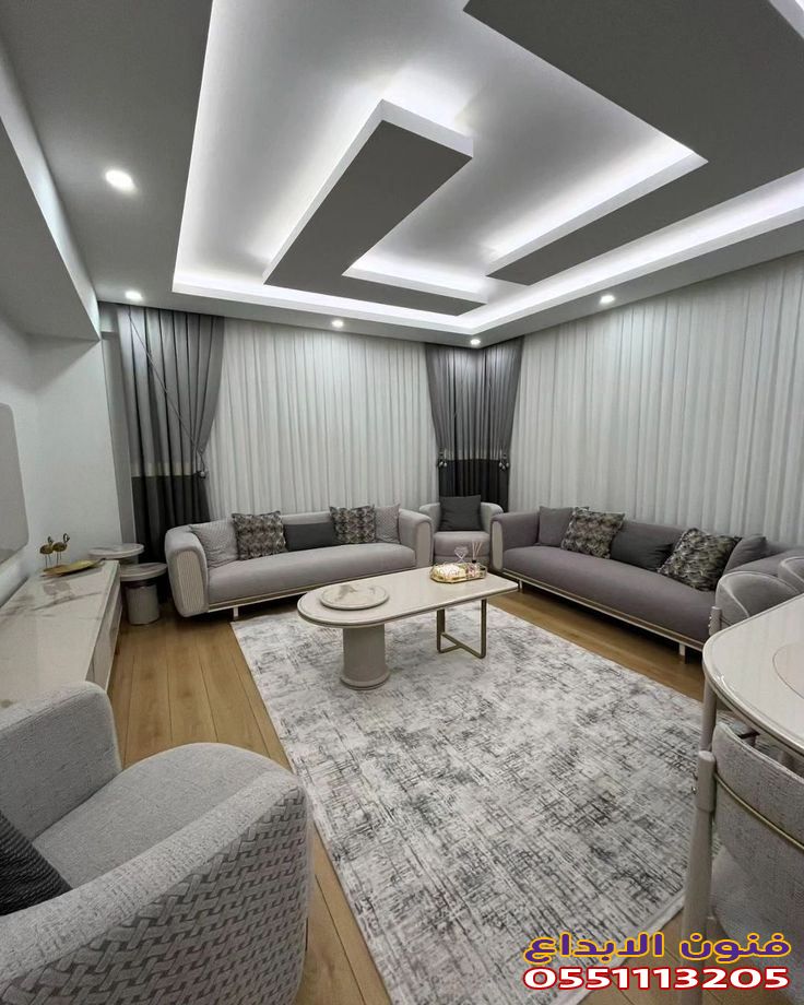 غرفة المعيشة: يفضل الألوان الهادئة مثل البيج، الرمادي الفاتح، والأزرق السماوي لإضفاء جو مريح.